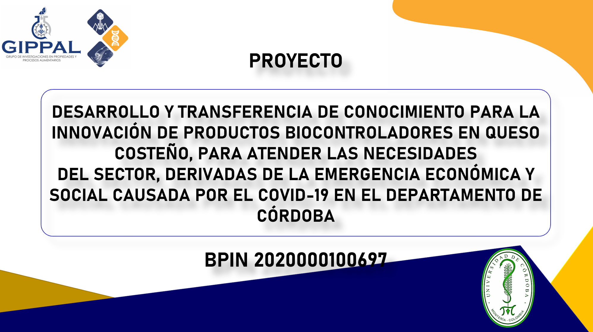 Las condiciones actuales revelan la importancia de combatir los microorganismos que pueden afectar la inocuidad de los alimentos en la industria agroalimentaria, de forma sustentable y eficiente. Dentro de este contexto, todas las personas involucradas deben actuar de manera contundente y preventiva en busca de mejores cualidades para los alimentos procesados, contribuyendo a evitar problemas de pérdidas económicas y contribuyendo a la seguridad alimentaria. El sector de derivados lácteos en Córdoba, especialmente los pequeños productores de quesos, debido a los problemas de la pandemia ocasionada por el Covid-19, se ha visto afectado en la producción y comercialización del producto, el cual además de tener problemas de inocuidad, también tiene una vida útil disminuida, lo que ocasiona pérdidas económicas y problemas de salud pública. Con este proyecto se busca reactivar la economía del sector quesero y tener un producto con alto valor agregado, inocuo y nutritivo que permita su comercialización, garantizando la seguridad alimentaria.